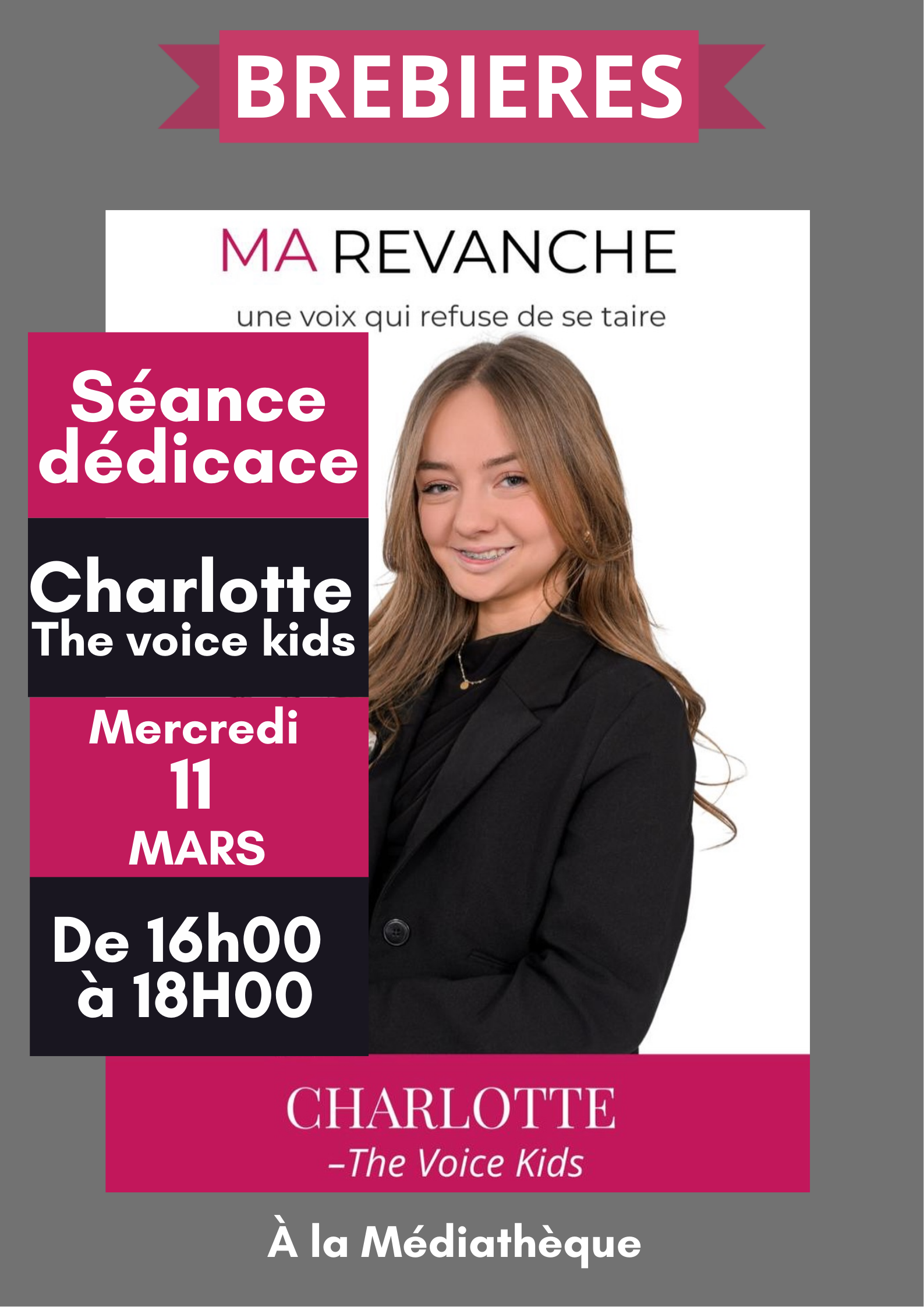 La Médiathèque de Brebières recevra Charlotte Deseigne, révélée dans l’émission The Voice Kids, à l’occasion d’une séance de dédicace consacrée à son livre « Ma Revanche – une voix qui refuse de se taire ».